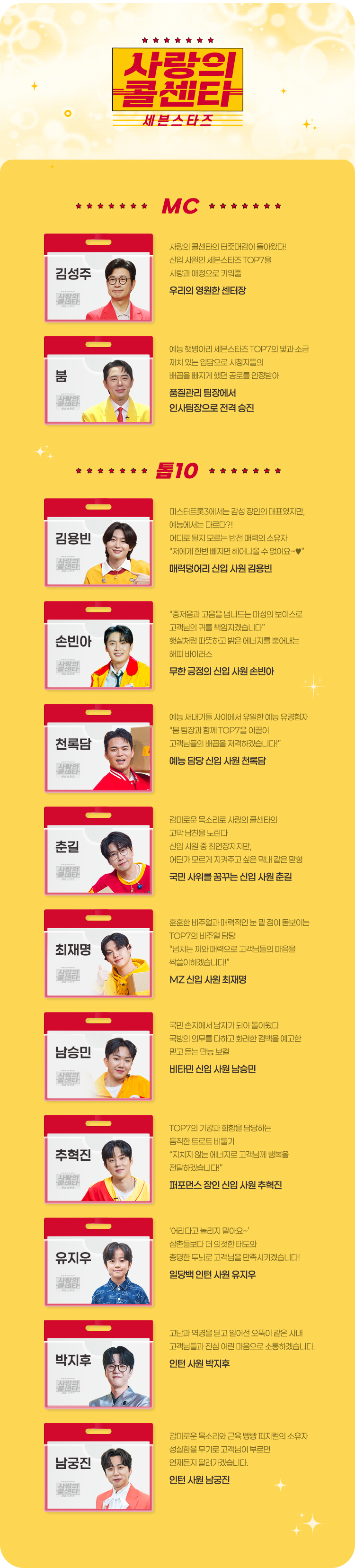 사랑의 콜센타 세븐스타즈 목요일 밤 10시 홈 스크랩 공유 공유 닫기 카카오톡 페이스북 트위터 URL 복사 네이버TV 카카오TV 프로그램 홈 프로그램 소개 출연자소개 예고편 방송클립 유튜브 다시보기 시청소감 프로그램 소개